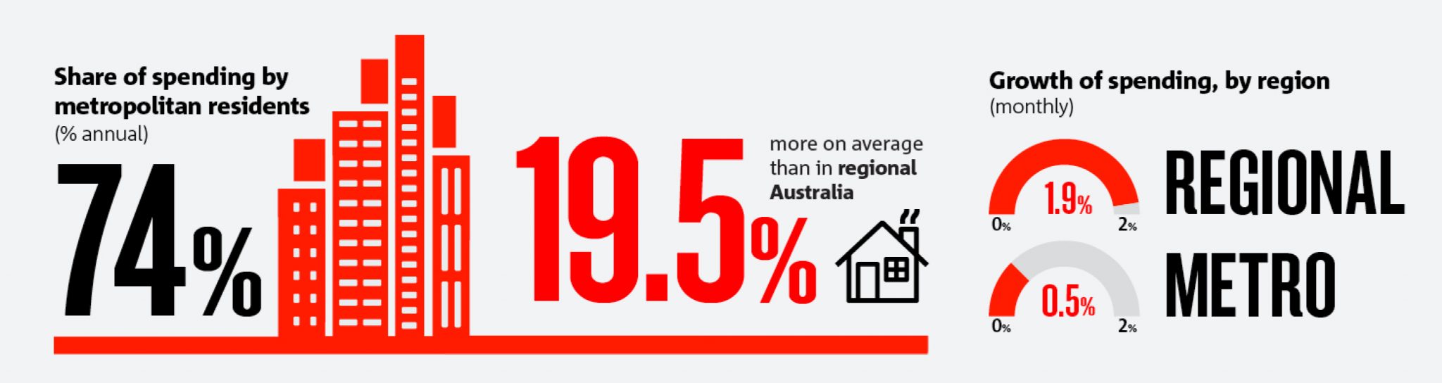 Metropolitan residents still greatly outstrip their regional counterparts when it comes to online retail spending, with 74% to 19.5% respectively. However the growth of spending on a monthly basis is slightly higher in the regions at 1.9% compared to 0.5% in metro areas.