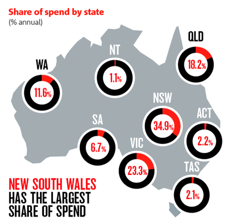 When it comes to a state-by-state comparison, total online spending is dominated by the three major Eastern States (NSW, VIC & QLD) at 76%, according to a report commissioned by Quantium.