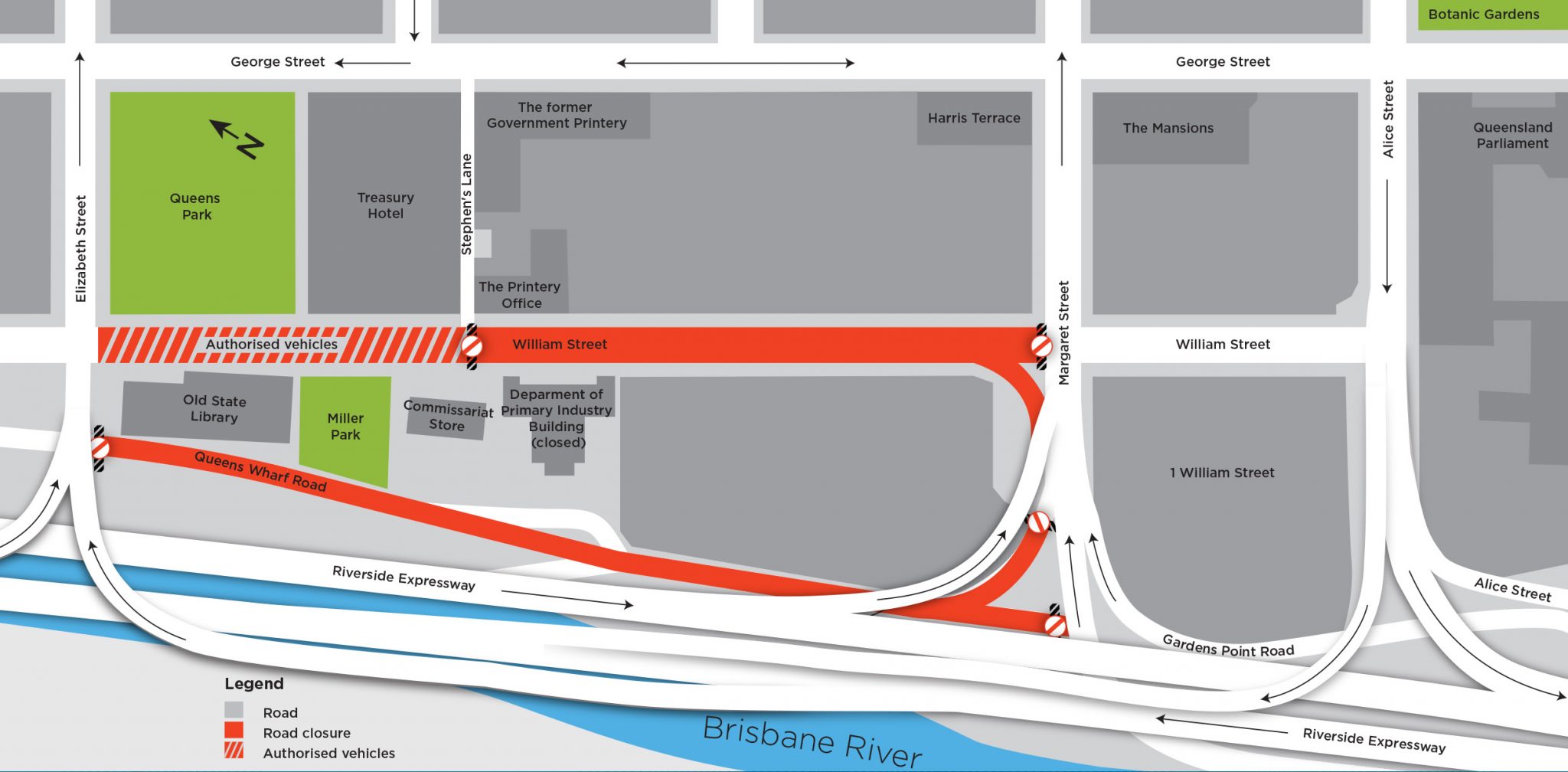 - Two CBD roads closed from 1 January 2017 to enable the project’s safe construction: a section of William Street, from Elizabeth to Margaret streets, during the build; and Queens Wharf Road permanently.